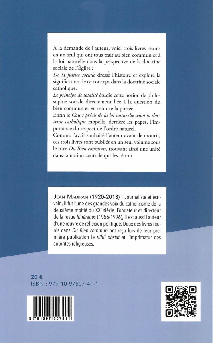 Tout au long de sa carrière de publiciste, Jean Madiran a manifesté et mis en œuvre une vaste et profonde connaissance de la philosophie sociale héritée d’Aristote et de saint Thomas d’Aquin, spécialement de la doctrine sociale de l’Église catholique puisée dans son Magistère. De nombreux ouvrages comme ceux qui vous sont aujourd’hui proposés, ou comme La vieillesse du monde qui décrit cliniquement de la nature du communisme, en témoignent. La collection de la revue Itinéraires qu’il avait fondée et qu’il dirigeait regorge d’articles qu’il a écrits ou suscités sur le principe de subsidiarité, la primauté de la contemplation, le nationalisme, la corporation, la primauté du bien commun etc.