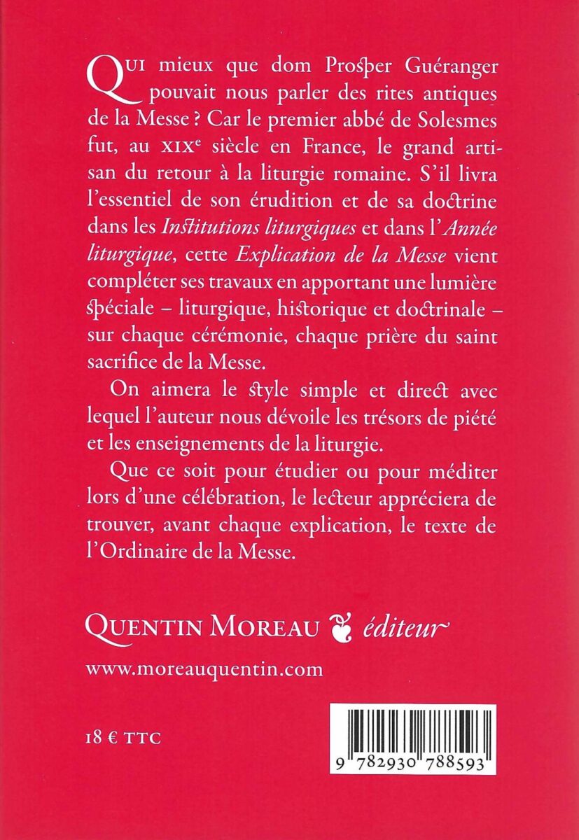 Dans ce qui fut, à l’origine, des conférences données à ses moines, le premier abbé de Solesmes, Dom Prosper Guéranger (1805-1875), commente les prières et les cérémonies de la Messe, nous en livre l’essentiel et nous en fait pénétrer les mystères. Ces conférences ont été éditées pour le public chrétien, à la demande notamment du cardinal Pie, et ont obtenu en leur temps un très beau succès.