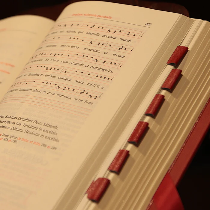 - Onglets en cuir apposés à la main.